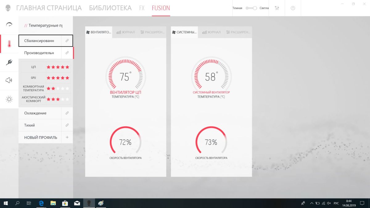 Из этого же приложения можно подкрутить под свои собственные нужды схемы управления питанием. Установить, как будет вести себя компьютер в зависимости от того или иного действия: от источника питания или без такового. Все это раздел AlienFusion.