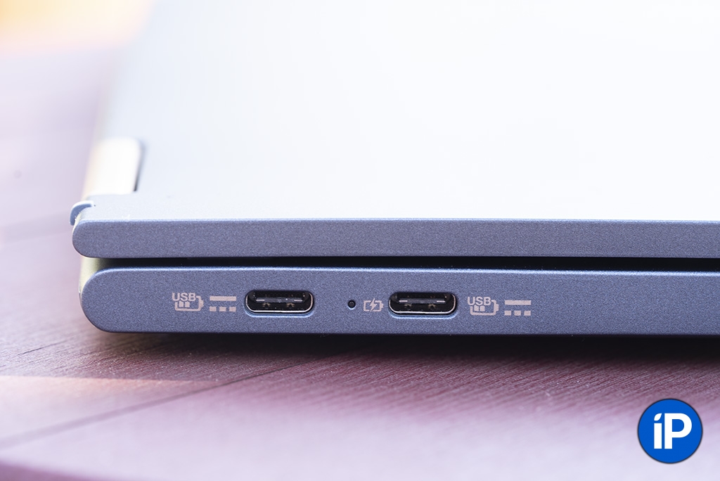 Все стыковочные порты раскинуты по бокам. Справа замок Kensington, USB (2.0), комбинированный 3.5 мм Jack для гарнитуры и SD-кардридер. Слева гнездо для зарядки, HDMI, USB (3.0), USB Type-C и два диода-индикатора активности. Через USB-C можно подключать фирменный док, который продается сразу с зарядным устройством, а ноутбук может не только подключаться к периферии через этот разъем, но и одновременно питаться от него.
