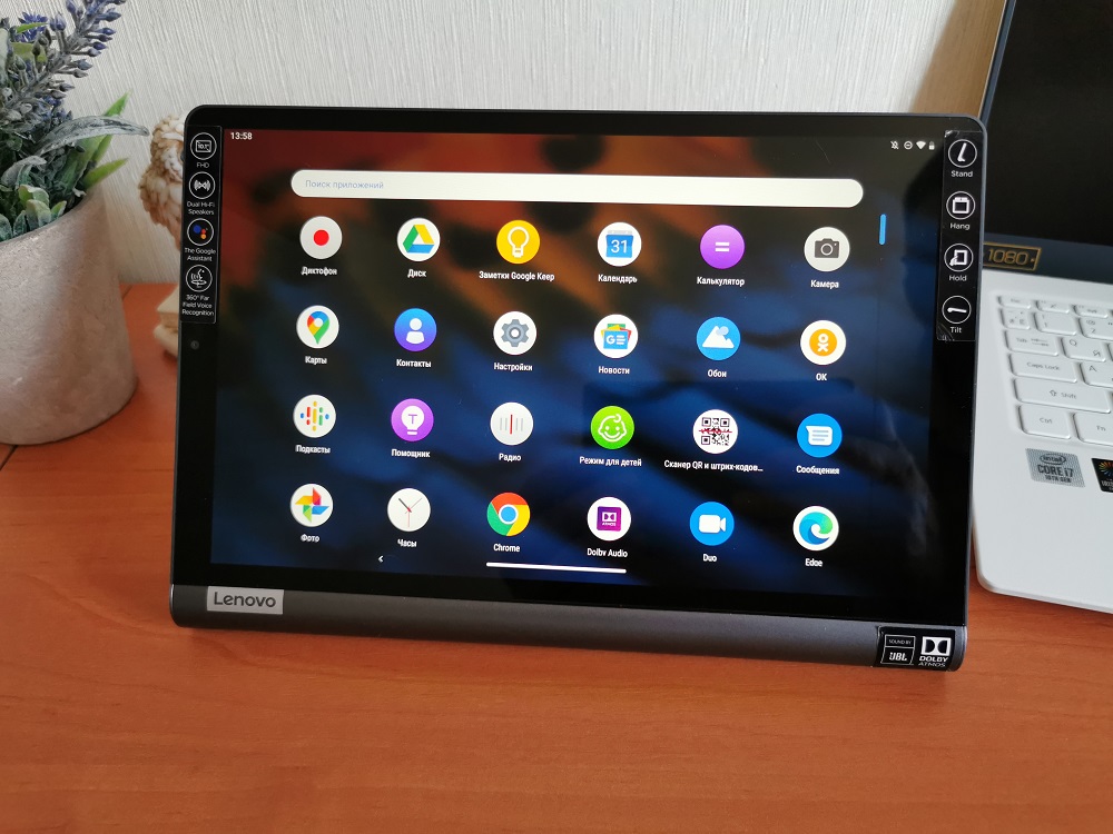Планшет примечателен наличием Google Помощника, инновационным дизайном, широкими боковыми рамками, подставкой, большими динамиками. Корпус с округлой нижней рукояткой удобно лежит в руке. Раскладная подставка надёжно удерживает экран на столе под разыми углами. Его даже повесить можно. Внизу по оба торца расположены крупные стереодинамики с ощутимыми басами и запасом громкости. При пиковой интенсивности звука спикеры не хрипят. Основная камера на 8 Мп делает неплохие снимки при естественном свете, распознаёт лица.