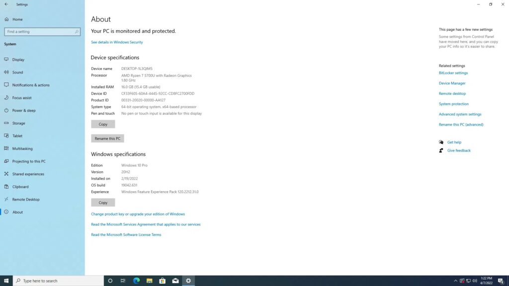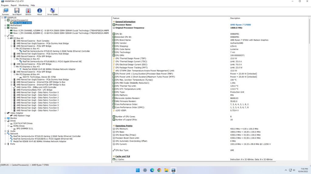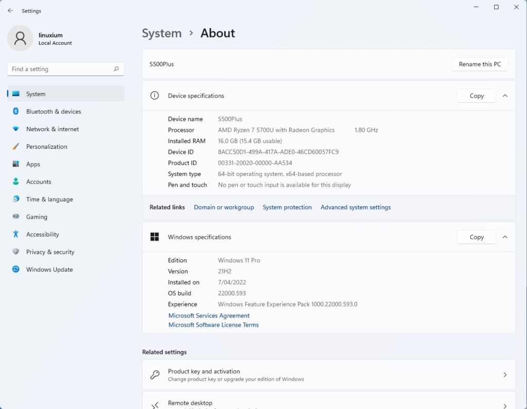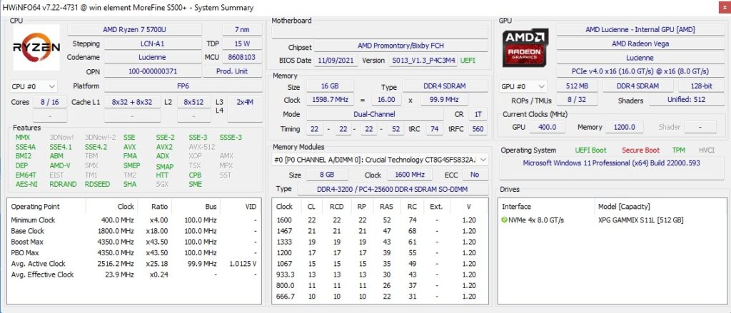 которую мы обновили до Windows 11 Pro версии 21H2, и после применения обновлений сборка стала 22000.593. Беглый взгляд на информацию об оборудовании показывает, что оно соответствует спецификации: