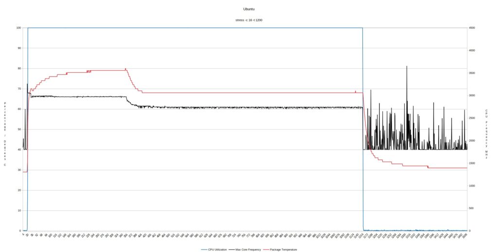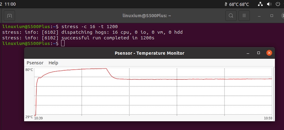 S500+ использует активное охлаждение, и во время стресс-теста на Ubuntu температура процессора поднялась до пика 80°C, а затем упала до 68°C, где она оставалась на протяжении всего теста:
