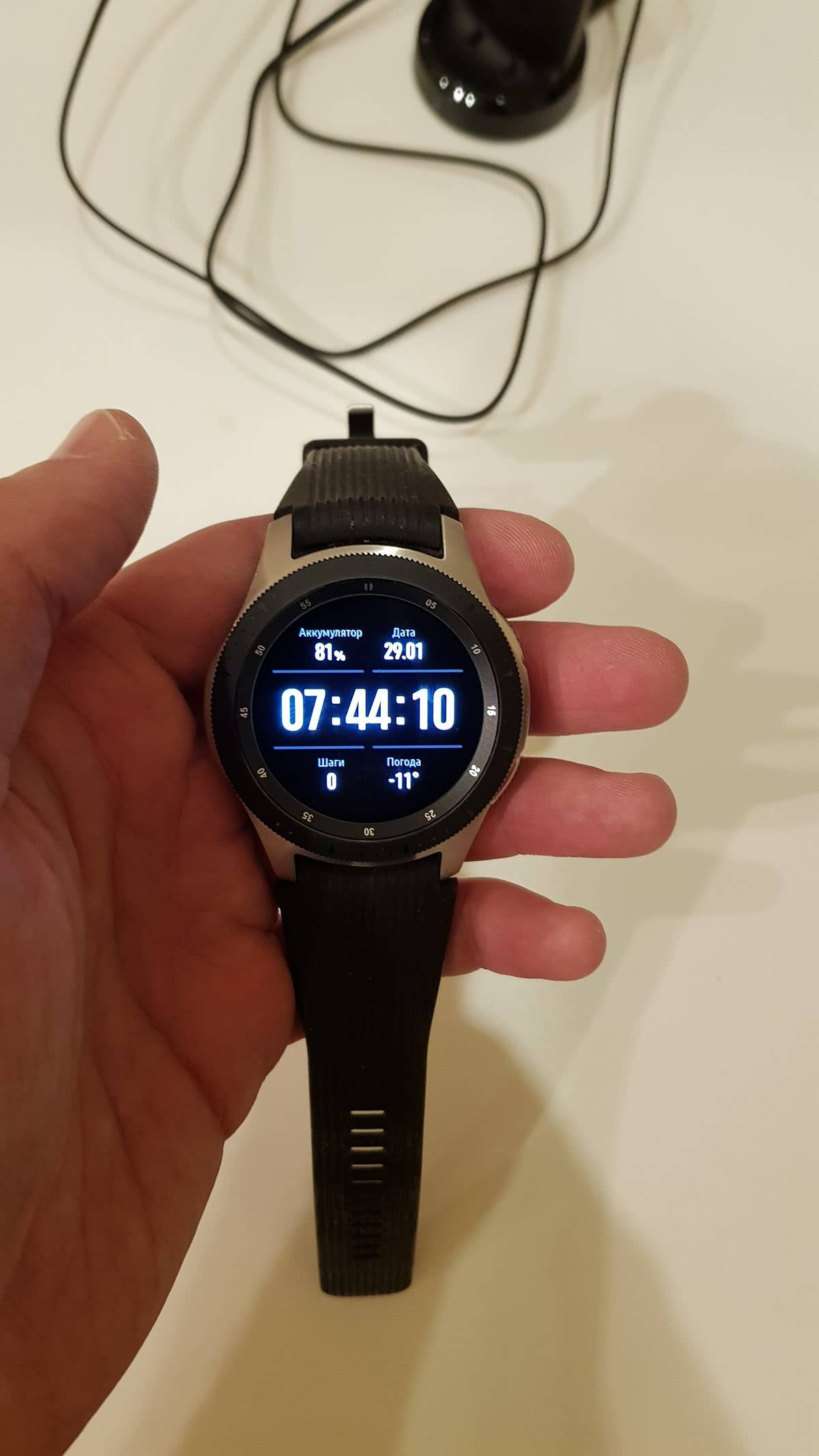 Экран Samsung Display имеет насыщенные цвета, максимальные углы обзора. Фирменный циферблат хорошо прорисован, благодаря чему гаджет Galaxy Watch максимально приближен к механическим наручным часам.
