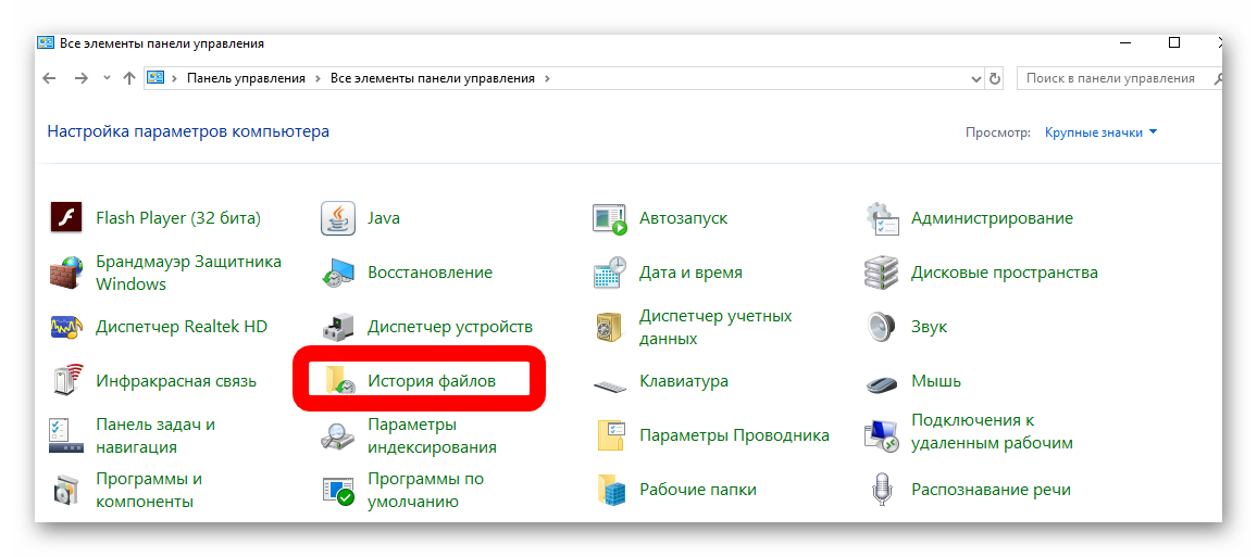 Найти функцию можно с панели управления, там она так и называется «История файлов». По сколько она не позволяет полностью восстановить систему, а лишь определенные файлы и папки, то здесь мы не будем ее полностью рассматривать. Ждите отдельную статью по этой функции.