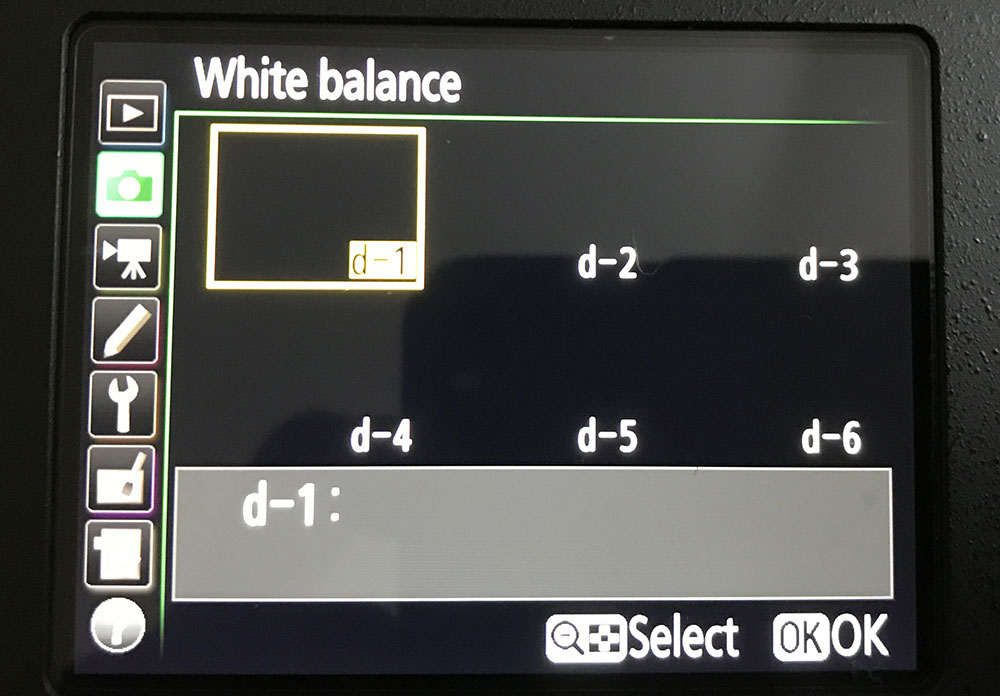 Такое меню открывается при нажатии на кнопку WB камеры Nikon. Поворачивая переднее или заднее колесико можно выбрать заказные или встроенные в камеру пресеты.
