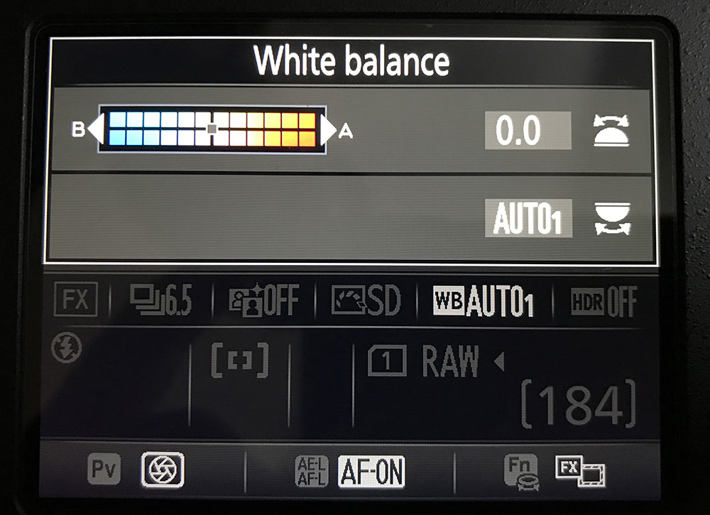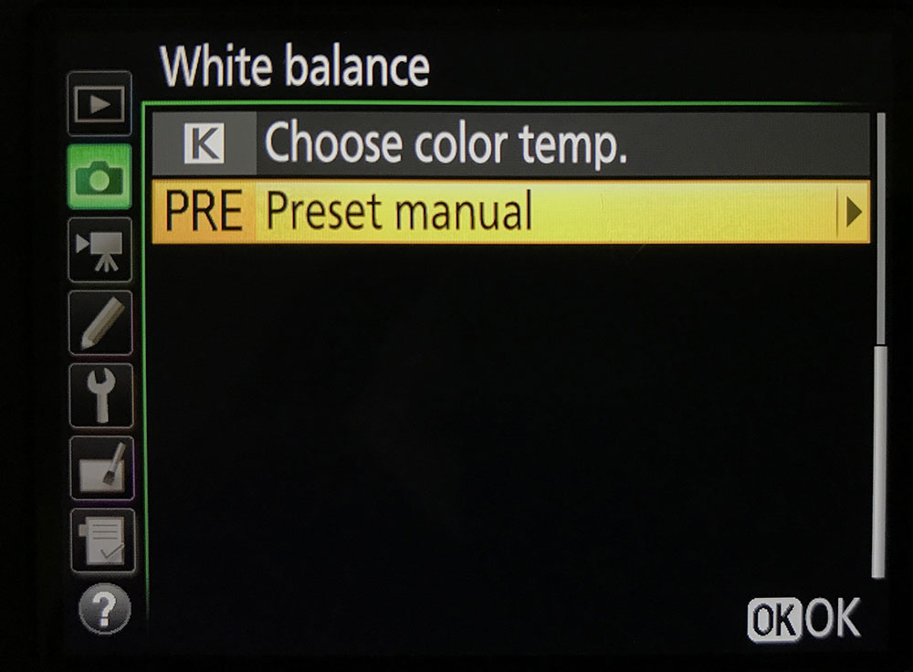 - Перейдите в настройки камеры, выберите баланс белого и откройте меню заказного баланса белого, либо нажмите кнопку WB и поворачивайте колесико до тех пор, пока не появится соответствующий значок.