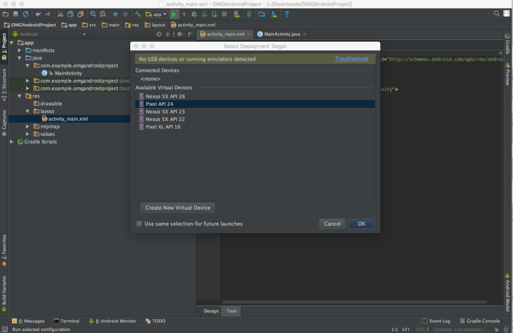 Несмотря на то что мы не написали ни строчки кода, мы вполне можем уже запустить только что созданный проект! Для запуска нужен девайс, либо виртуальный, либо реальный. Реального у нас пока нет, поэтому запустим виртуальный. Нам необходимо создать новый виртуальный девайс на основе версии платформы Android 2.3.3. Делается это через