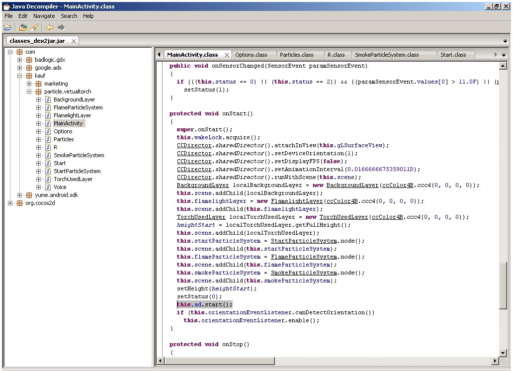 После этого в каталоге com.kauf.particle.virtualtorch появится файловое дерево, похожее на описанное в предыдущем разделе, но с дополнительным каталогом smali вместо dex-файлов и файлом apktool.yml. Первый содержит дизассемблированный код исполняемого dex-файла приложения, второй — служебную информацию, необходимую apktool для сборки пакета обратно.