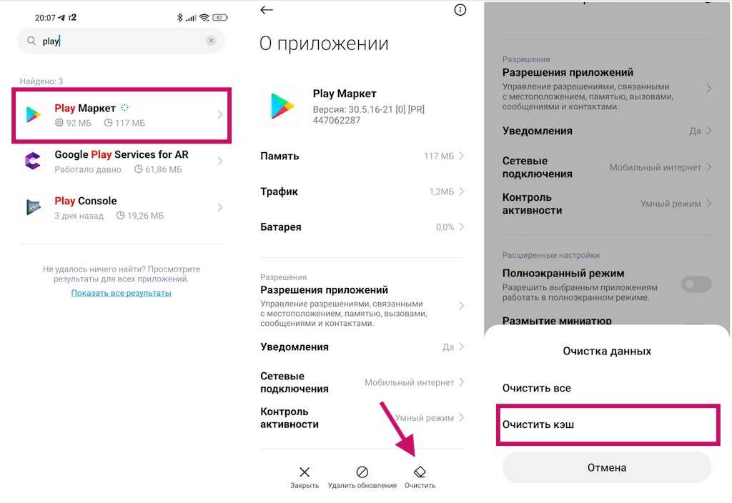 Когда предыдущий пункт выполнен, но всё равно не работает Плей Маркет на Android, сотрите кэш. Довольно часто конфигурация взаимодействия сервиса с мобильным аппаратом «криво» настроена. Выручат нехитрые манипуляции с меню: