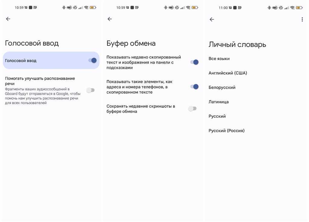 Gboard также позволяет включать и отключать скользящий и голосовой ввод текста. Есть встроенный буфер обмена, который позволит вам быстро получить доступ к скопированному тексту. Наконец, вы можете настроить Личный словарь, чтобы автокоррекция не меняла то, что вы пытаетесь сказать.