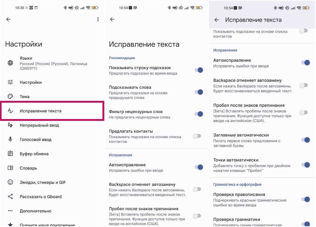 Среди предложенных вариантом можно выбрать подсказки слов и имен, возможность сохранения текста в пользовательском словаре, автоисправление и блокировку нецензурных слов. Новые версии позволяют сделать и другие действия, например, использовать заготовки из целых фраз и предложений.