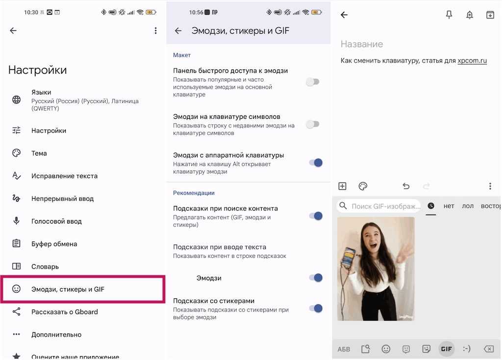Эти настройки позволяют добавить на клавиатуру строку быстрого доступа к эмодзи и строку недавно использованных эмодзи. Вы можете настроить кнопку для клавиатуры с эмодзи и включить интеллектуальный поиск GIF-ок, смайликов и стикеров.