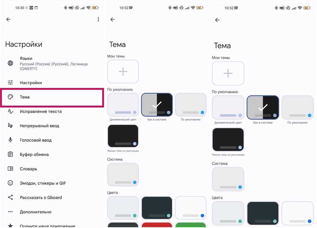 Темы Gboard включают в себя настройку на темную или светлую тему или выбор между несколькими цветами, пейзажными фотографиями, светлыми и темными градиентами. Вы можете загрузить сторонние темы Gboard и добавить их, нажав на значок + в разделе «Мои темы».