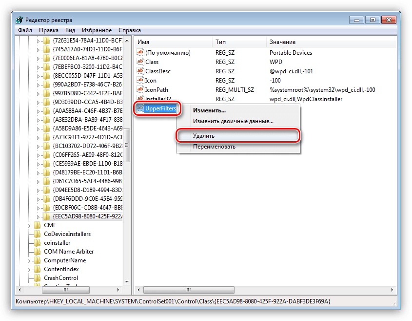 «UpperFilters»ПКМ – «Удалить»