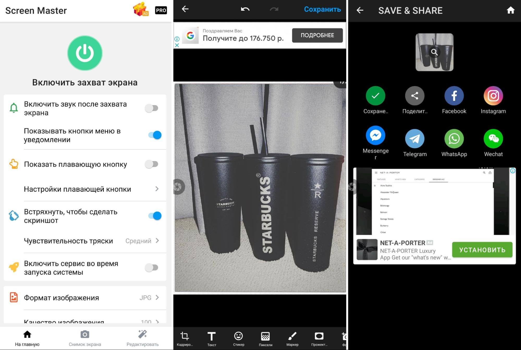 Это приложение помогает сделать скрины несколькими способами: из панели уведомлений, расположив плавающую кнопку поверх экрана или просто встряхнув устройство. Поддерживается создание длинных скриншотов, специальный режим для захвата веб-страницы и запись видео (в платной версии). Во внутреннем редакторе картинку можно кадрировать, добавить текст и стикеры, рисовать и даже наложить поверх еще одно изображение.