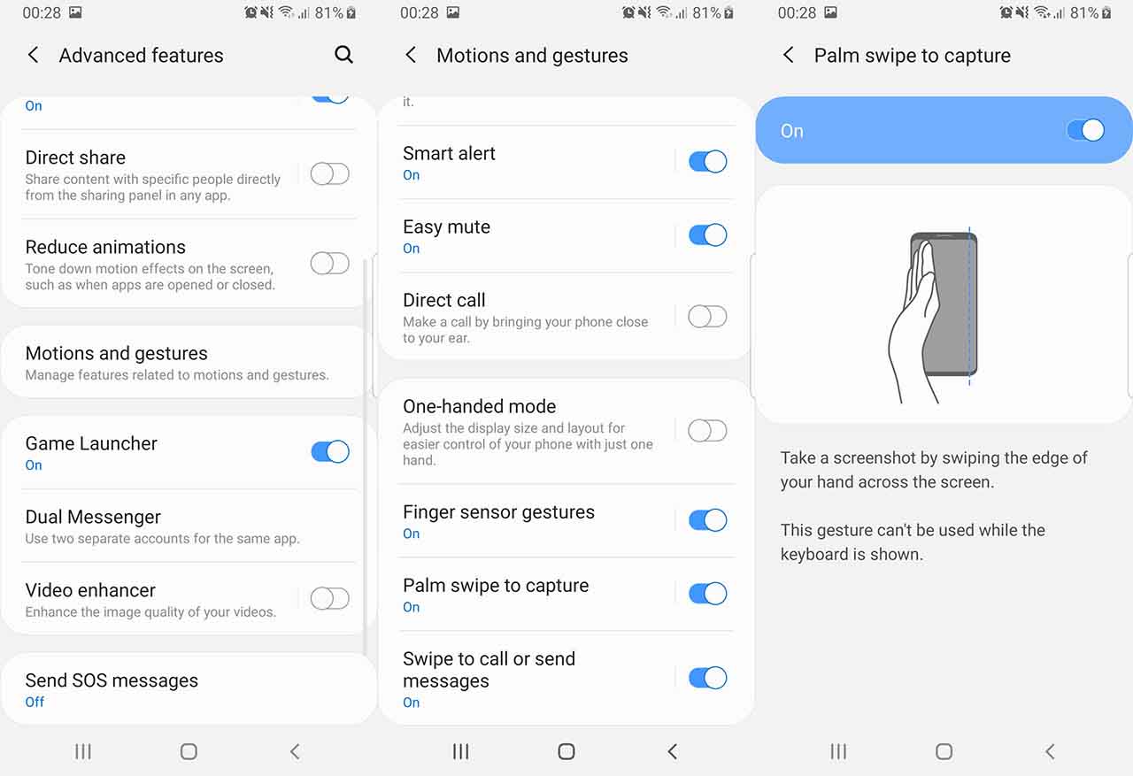 Чтобы включить Palm Swipe, перейдите в Настройки -> Расширенные функции -> Движения и жесты. Будет вариант под названием Проведите пальцем по ладони, чтобы захватить. По умолчанию он отключен. Нажмите на него, чтобы включить. Теперь проведите рукой по экрану, чтобы сделать снимок экрана. Телефон будет вибрировать, показывая, что задача выполнена.