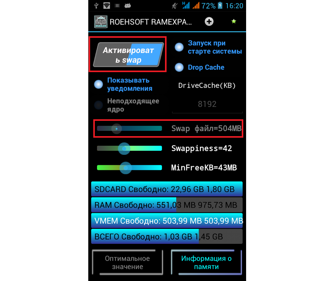 Файл подкачки позволяет расширить стандартный объем оперативной памяти. Например, из 512 Мб можно сделать 1 Гб или даже больше. Все работает максимально просто. Устанавливается специальная программа, которая создает на внешнем хранилище (SD-карте) файл указанного размера. Например, если нужно увеличить RAM на 2 Гб, необходимо выбрать объем в 2 Гб и освободить столько же памяти на SD-карте. После расширения оперативной памяти перестанут закрываться фоновые приложения, а также могут решиться проблемы с «вылетами» в играх на слабых девайсах.