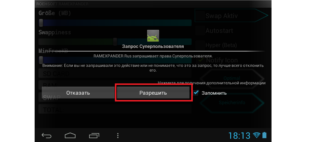 - Программа нуждается в упомянутых выше правах суперпользователя. Но получать их отдельно не нужно. SWAPit RAM EXPANDER самостоятельно даст рут права вашему устройству. Для этого лишь нужно нажать на кнопку «Разрешить» в появившемся окне.