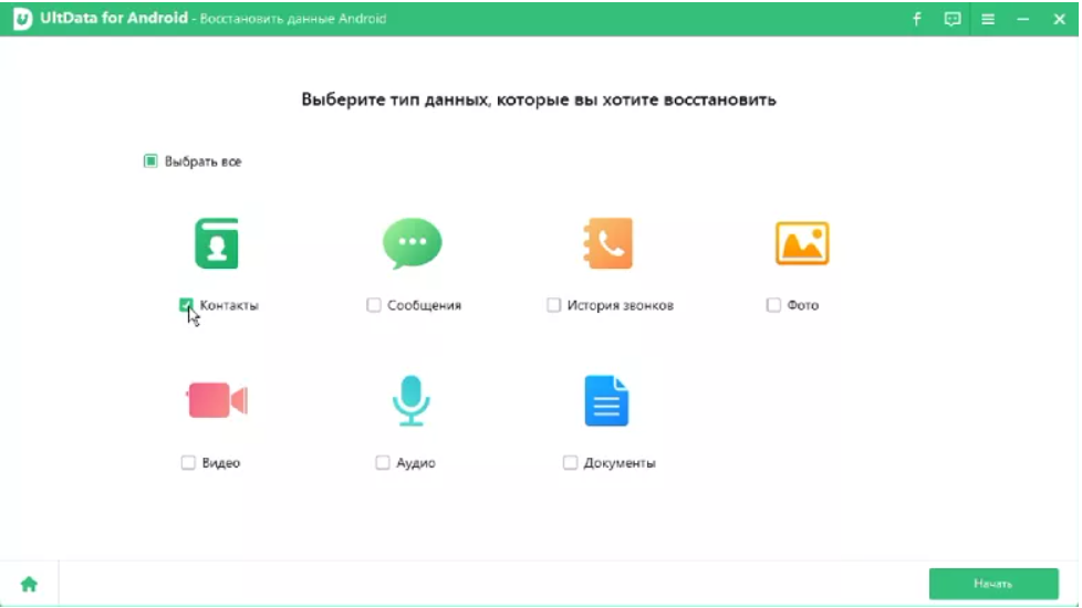 - Далее запускают утилиту на смартфоне, отмечают данные, которые планируется восстановить. Нажимают кнопку «Далее».