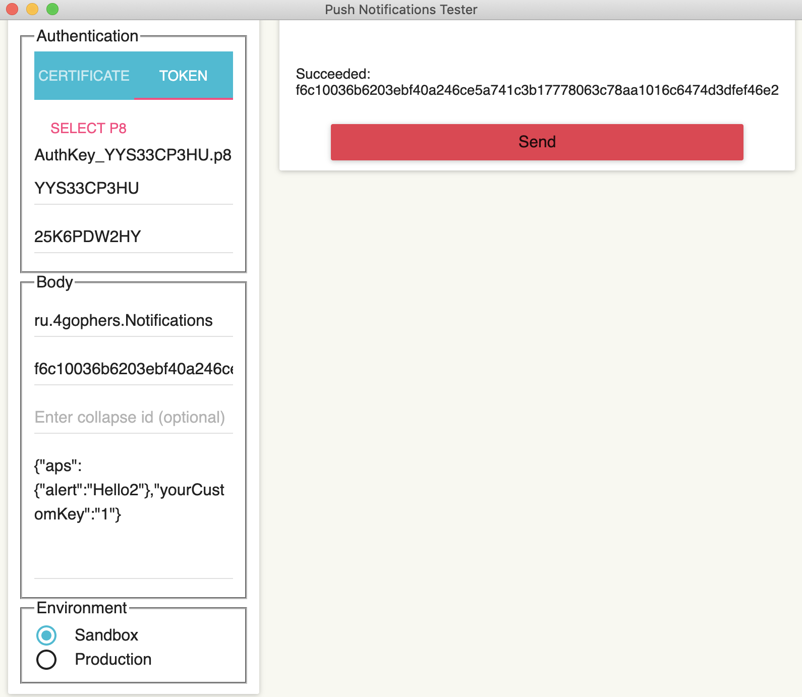 Приложений для тестирования уведомлений целая куча, но мне больше всего нравится PushNotifications. Переключитесь на вкладку TOKEN и укажите нужные данные.