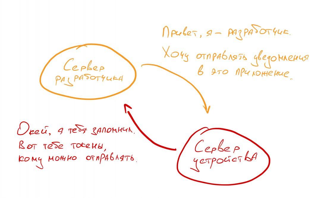 - Но сервер устройства не скажет этот токен серверу разработчика.