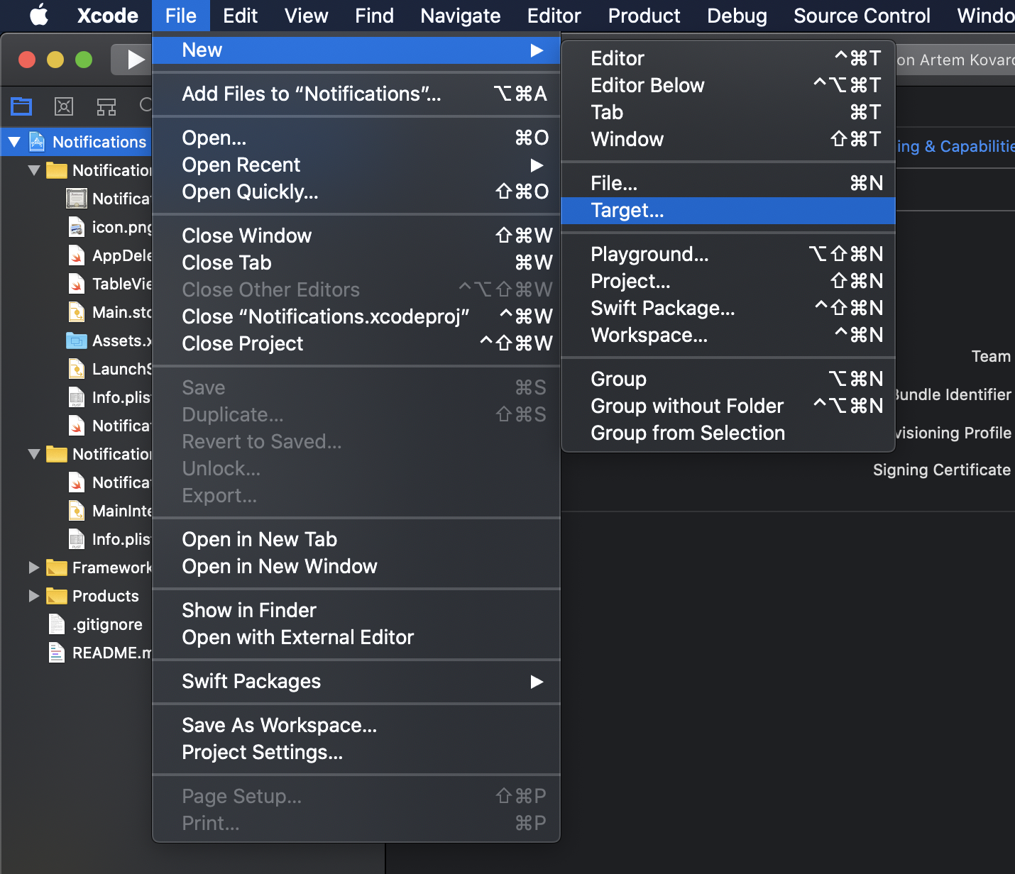 Но этот метод позволяет получить данные уже после показа уведомления. А в iOS есть возможность кастомизировать контент уведомления с помощью экстеншенов. Например, можно задавать кастомную картинку для каждого уведомления. Для этого нужно создать расширение Notification Content Extension как показано на скриншотах.