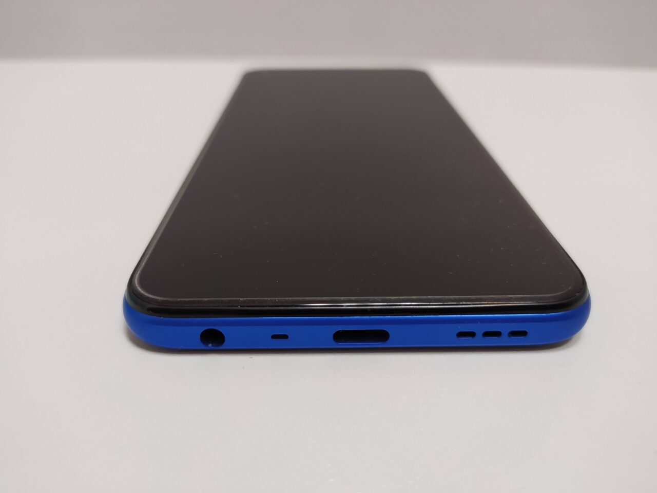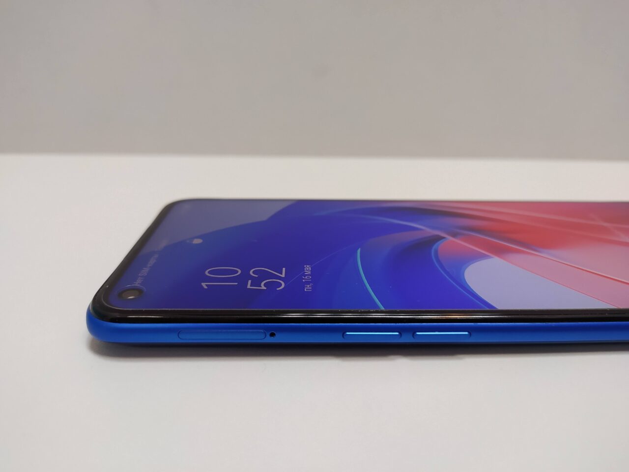 Первое, что бросается в глаза — это расположение фронтальной камеры. Она расположена в левой верхней части дисплея в виде круглого выреза. Вполне комфортное решение, ведь полезная информация обычно расположена правее, а при горизонтальном расположении телефона — выше. Такое расположение камеры позволяет максимально использовать полезную площадь. Разговорный динамик представляет собой тонкую полоску над экраном.