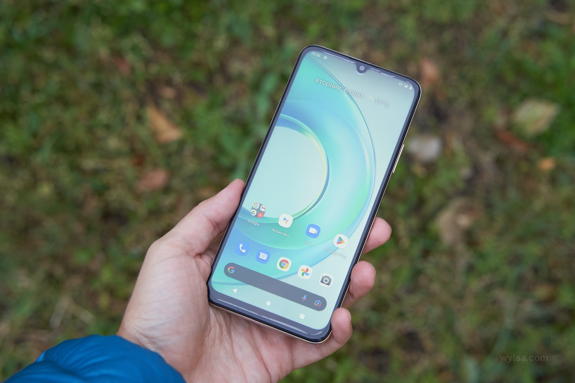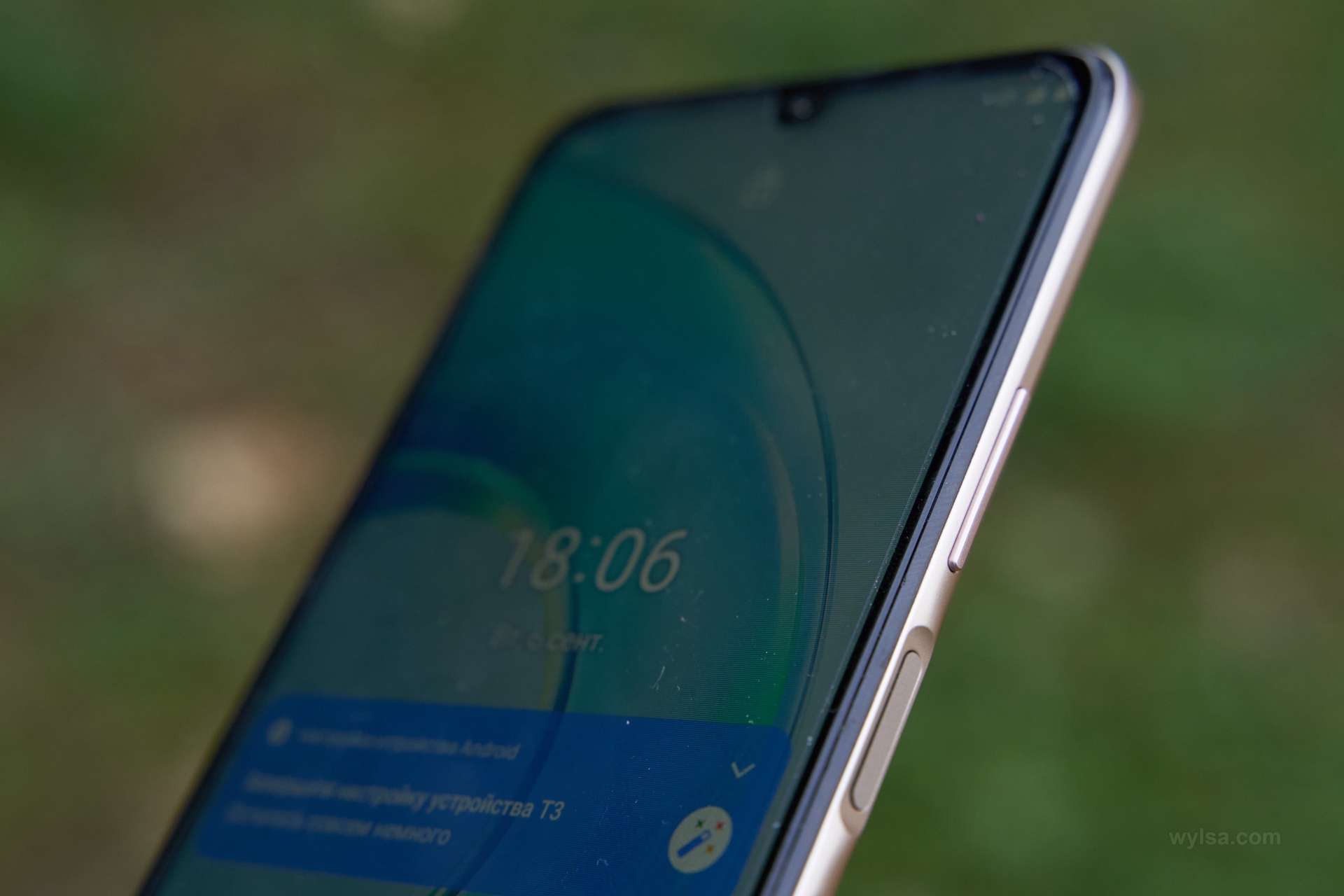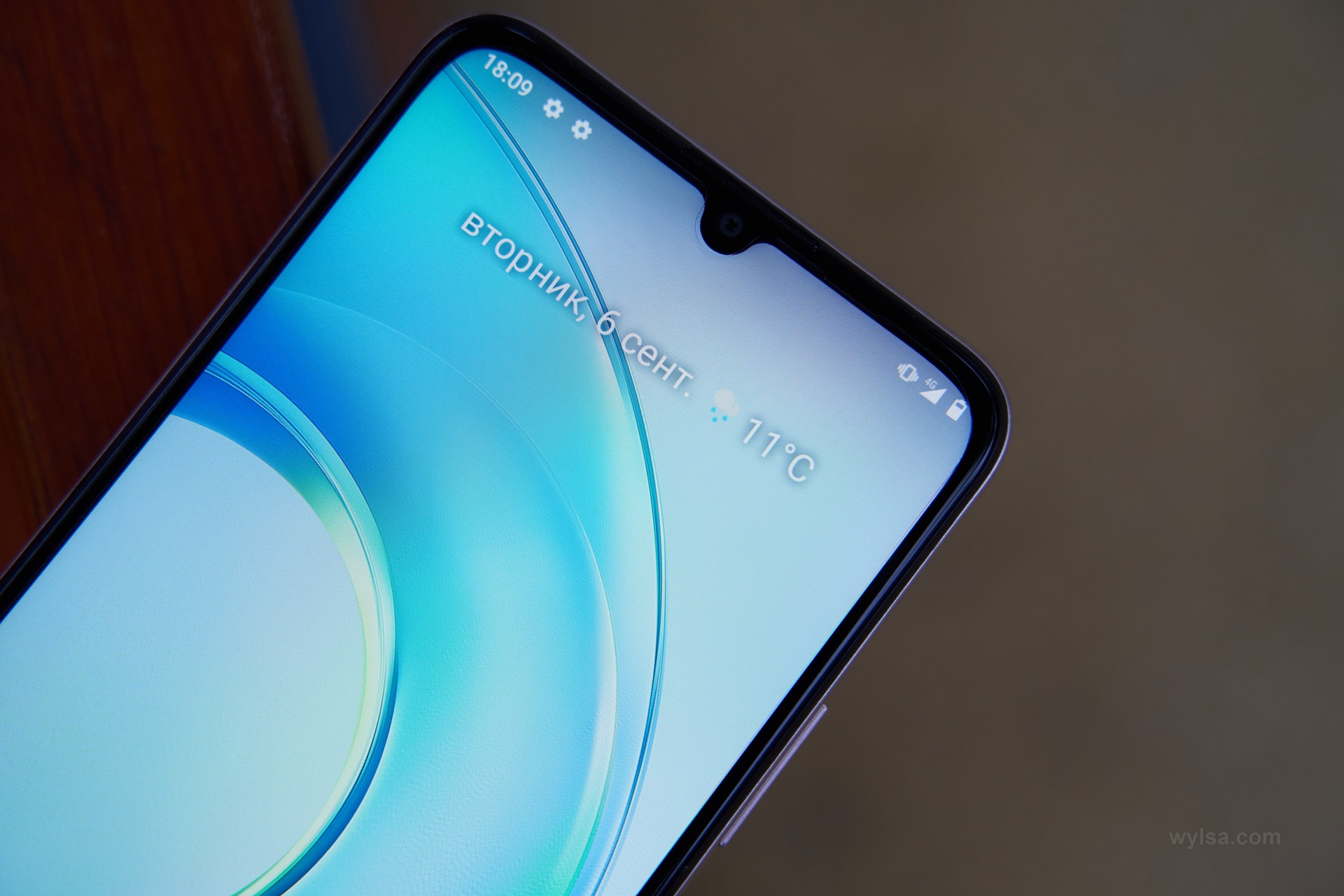 Камера расположена в вырезе по центру, экран с закруглёнными углами. На первый взгляд эстетично, однако они закрывают часть интерфейса, что хорошо видно по индикатору заряда батареи.