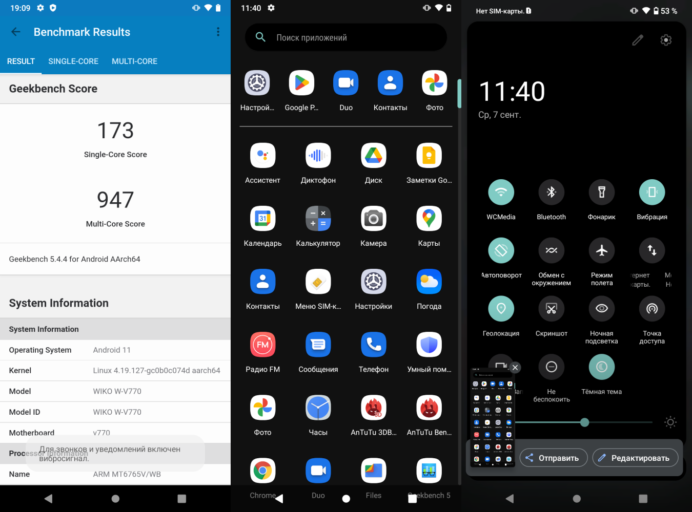 Запас по яркости небольшой, под ярким солнцем экран слепнет. Присутствует автоматическая регулировка подсветки, при желании она настраивается и вручную. Из опций можно выделить ночной режим, когда по вечерам изображение принимает желтоватый оттенок, и тёмную тему оформления.
