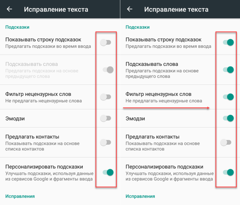 Шаг 2. Передвиньте ползунки «Показывать строку подсказок» и «Подсказывать слова» в состояние включено. Кроме того, вы можете включить или отключить фильтр нецензурных слов, разрешить или запретить использовать в качестве подсказок контакты.