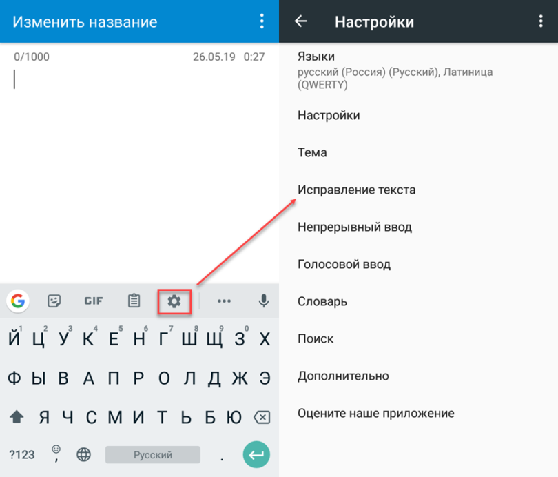 Шаг 1. Вызовите клавиатуру и нажмите на значок в виде шестеренки, чтобы перейти в настройки. В открывшемся окне тапните на строку «Исправление текста».