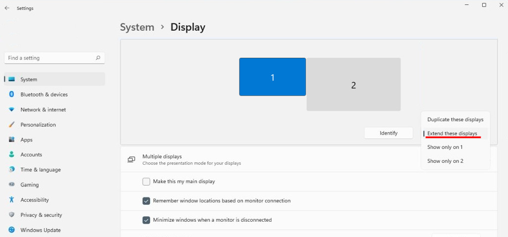 Затем можно изменить режим многоэкранного отображения. В Windows доступны 4 режима: