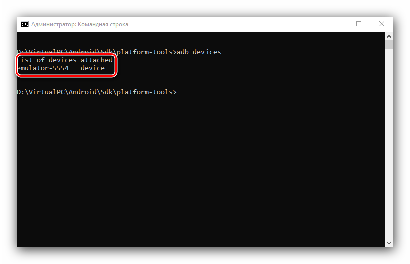 В интерфейсе ввода команд перейдите к папке с ADB, после чего введите команду adb devices.