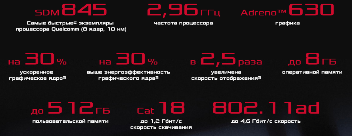 | процессор | 2.96GHz специально оборудованная мобильная платформа Qualcomm Snapdragon 845 с 10-нм, 64-разрядным октановым процессором |