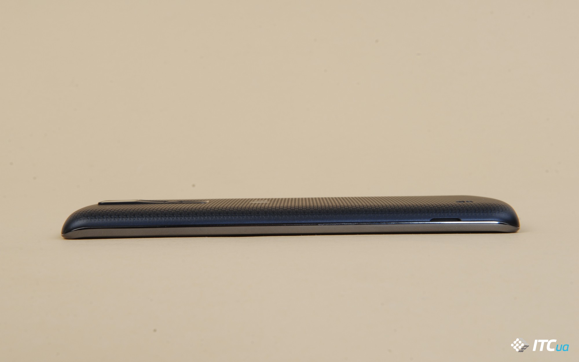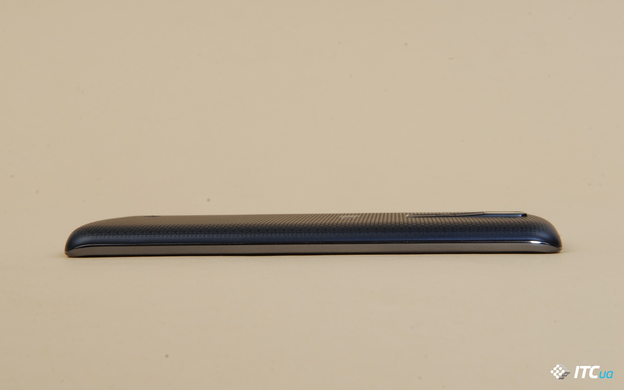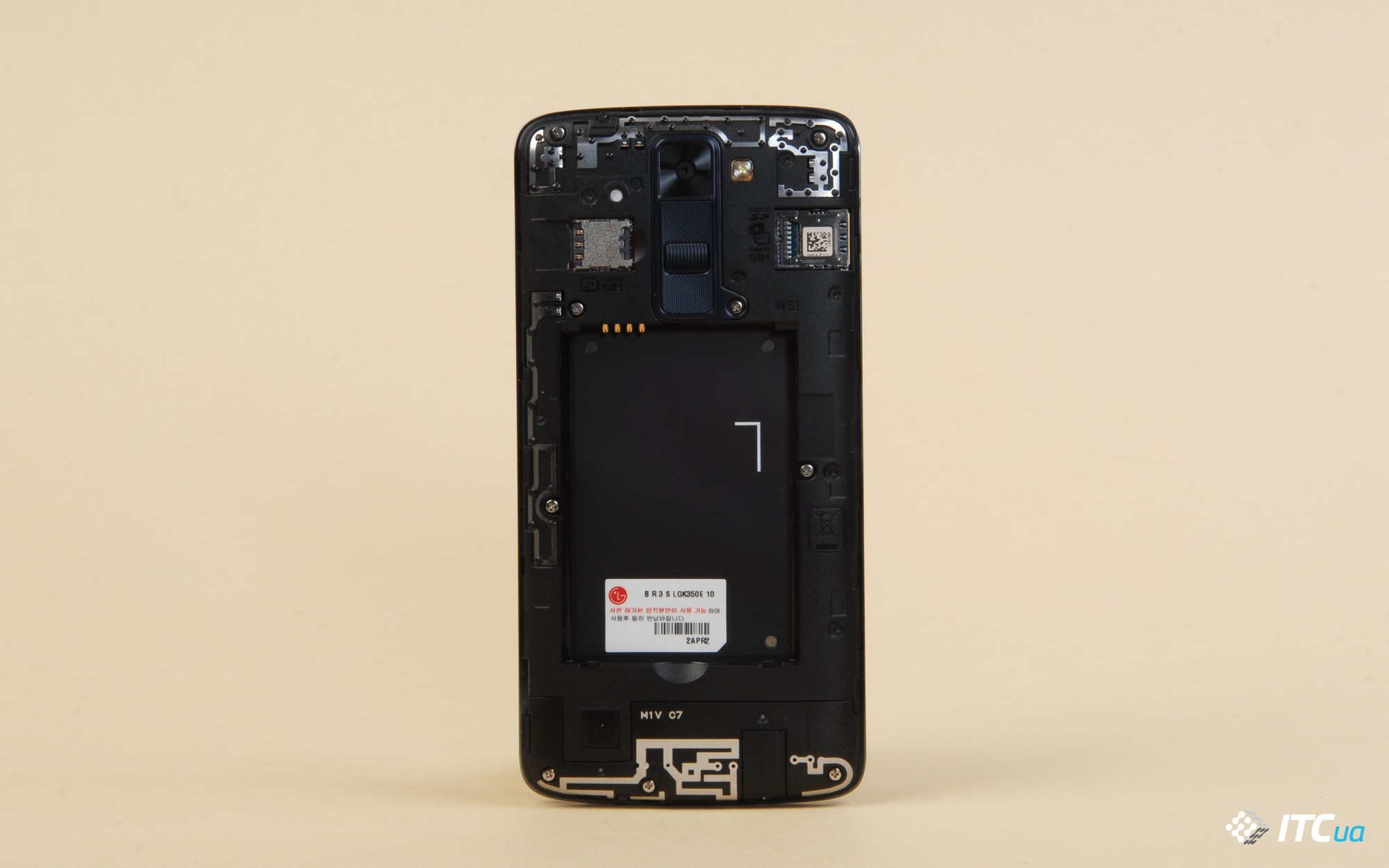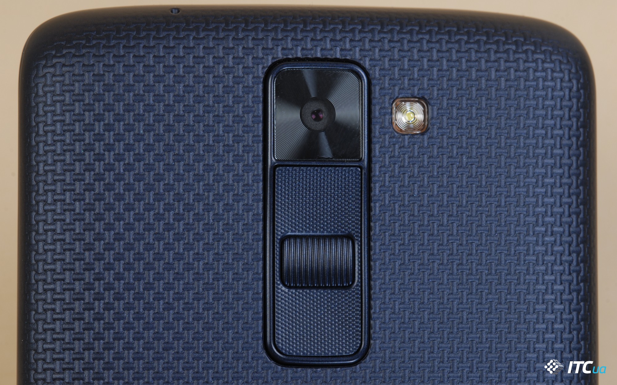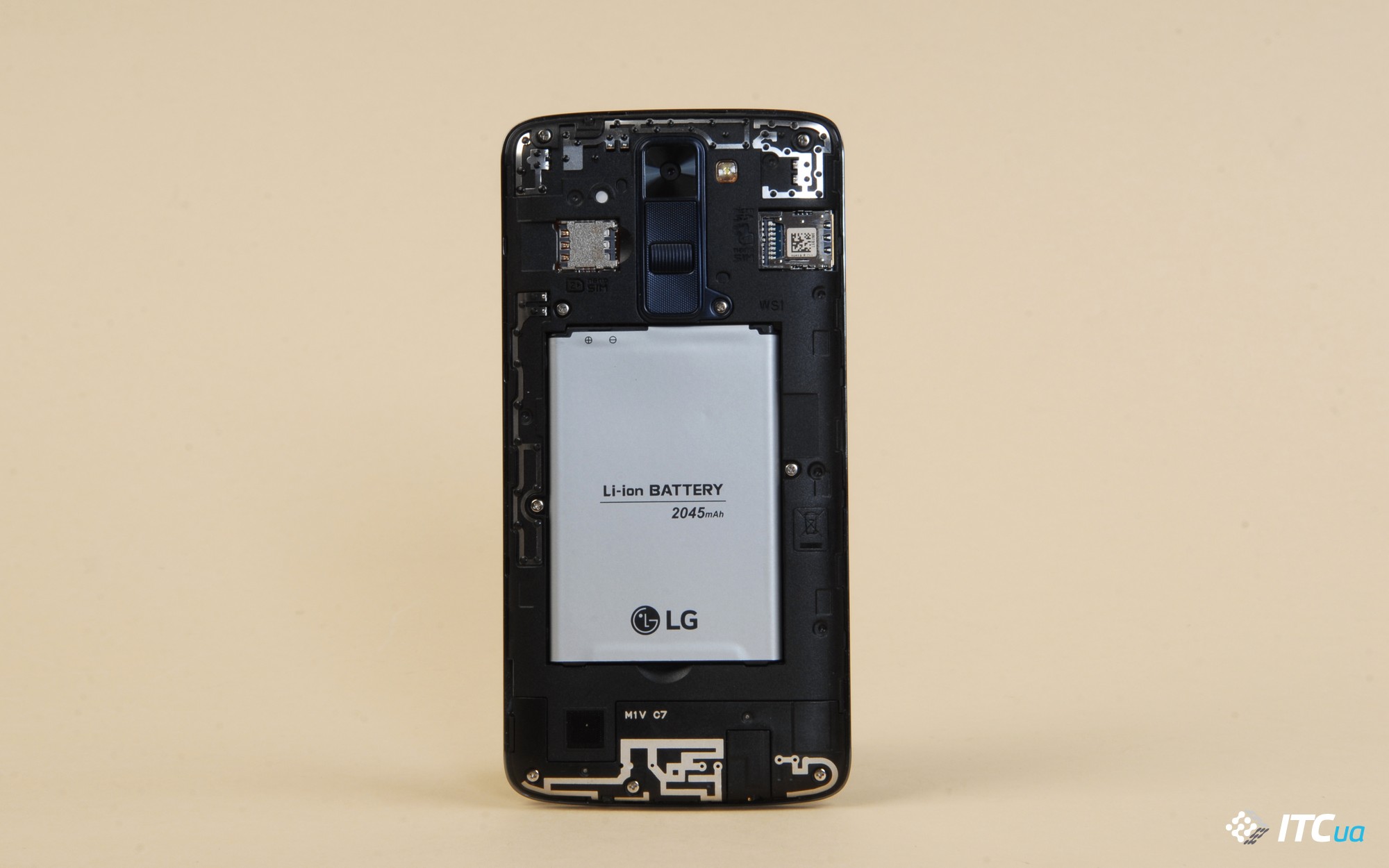 Крышка выполнена из того же пластика с мелким узором, что придает телефону большей цепкости. Расположение механических клавиш традиционное для смартфонов LG — на тыльной стороне. Там же находится и мультимедийный динамик.