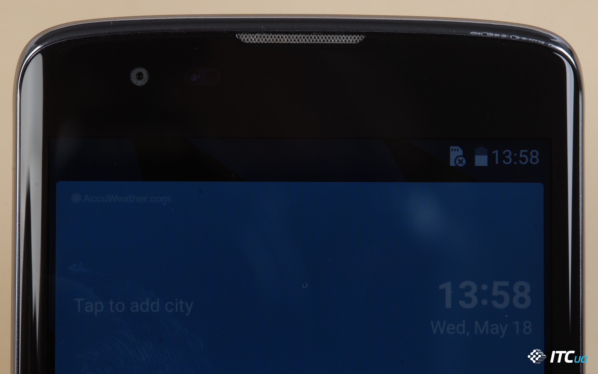 Что касается фронтально панели, то немного левее разговорного динамика расположилась фронтальная камера и датчик освещения. К слову, на модели LG K8 K350e LTE (да, полностью смартфон называется именно так), датчик яркости практически не виден, в то время как на устройстве белого цвета этот датчик очень сильно выделяется.