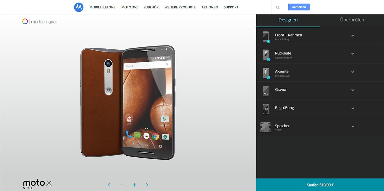 Как и его предшественники, телефон имеет изогнутую заднюю часть корпуса и алюминиевый корпус. Цвет задней части корпуса и металлической отделки телефона может быть изменен покупателями перед покупкой телефона с помощью Motorola Moto Maker, который предлагает заднюю часть корпуса из таких материалов, как кожа Horween , дерево и силикон, а также количество цветов для металлическая отделка.