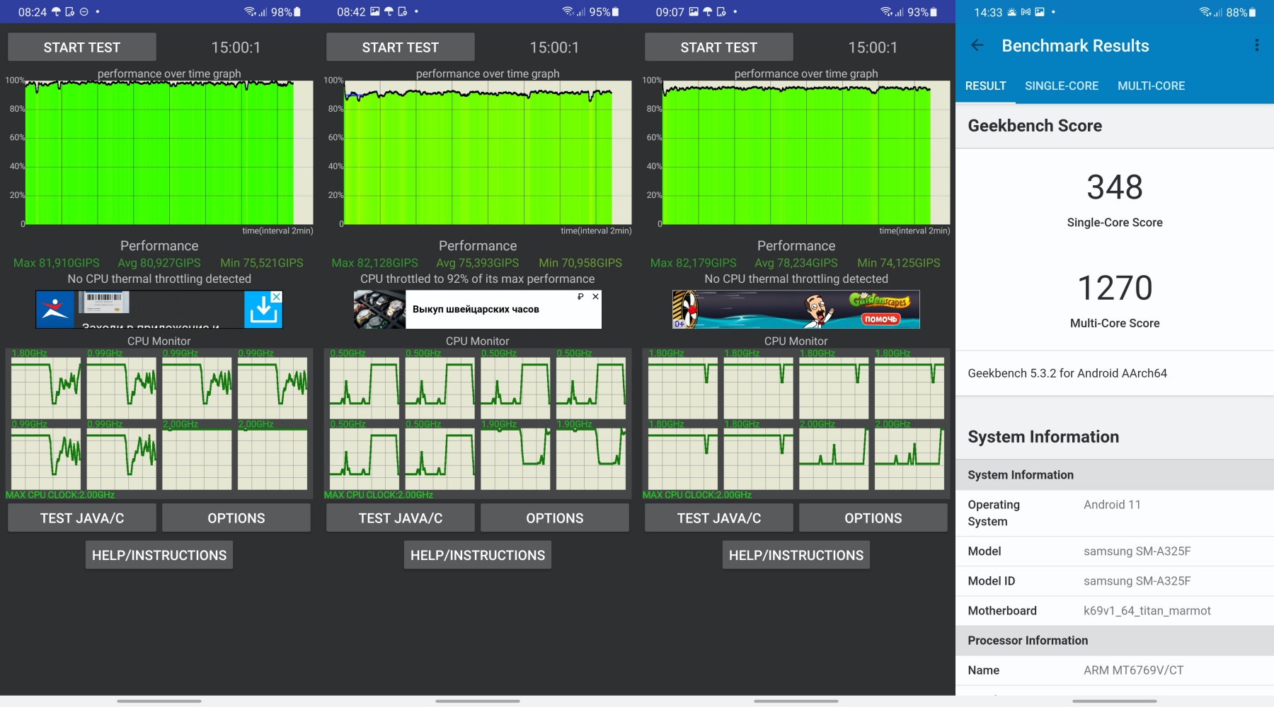 Судя по тестам, телефон работает очень стабильно под нагрузкой и цикл из нескольких троттлинг-тестов прошёл без особого напряжения. В то же время само меню работает не очень быстро — я думаю, вся проблема в не финальном софте и после выхода финальной ОС вопросов быть не должно. По крайней мере, у Galaxy A31 с этим было всё в порядке.