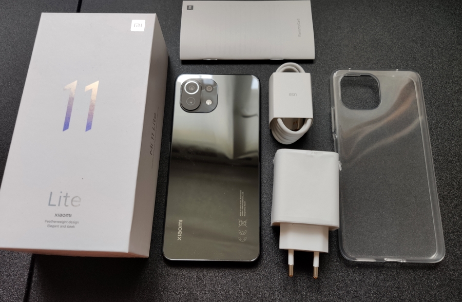 Поставляется устройство в узнаваемой коробке из белого плотного картона с названием серии и модели. И комплектация у Mi 11 Lite довольно приятная. Так, в коробке со смартфоном можно найти зарядное устройство на 33 Вт, кабель USB-A – USB Type-C, скрепку для извлечения лотка для карт, переходник с Type-C на 3,5 мм миниджек для проводных наушников, прозрачный силиконовый чехол-бампер и гарантийный талон.