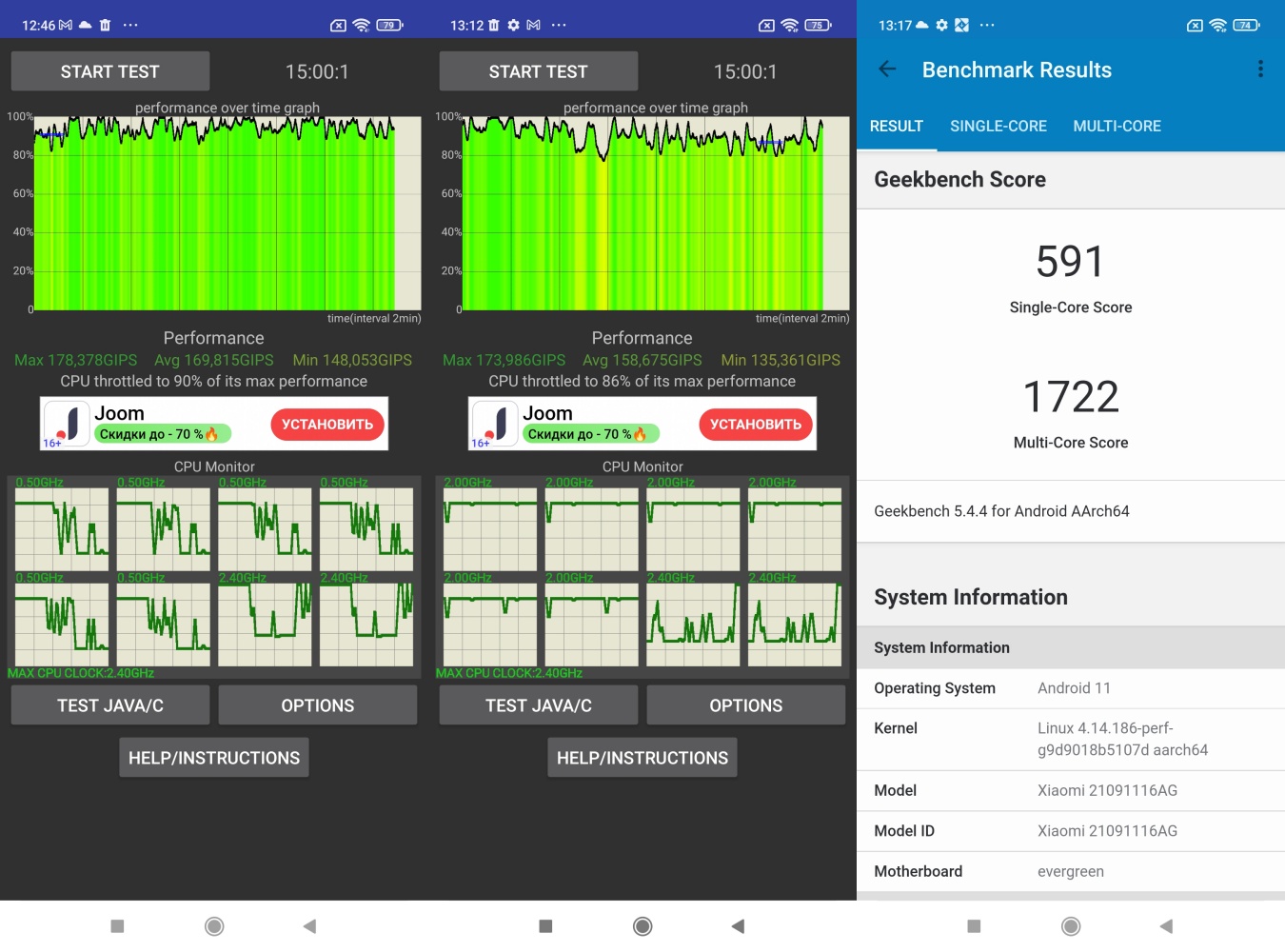 Чипсет MediaTek Dimensity 810 — свежее решение, представленное осенью 2021 года. Это замена для Dimensity 700 со всеми вытекающими последствиями. Чип выполнен по 6-нм техпроцессу и нормально справляется со всеми задачами. Чудес не бывает, так что Genshin Impact на максималках тут не пойдёт, но с обычными играми вроде «танков» телефон справляется спокойно, не перегревается. Если тестить на троттлинг, то на графике видно, как частота проседает на 20 %. Не смертельно для простого телефона.