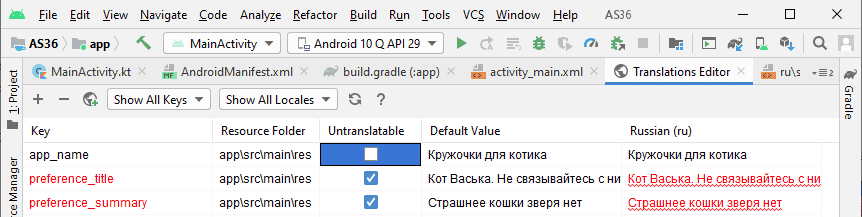 Если вы решили использовать локализацию на разных языках, то можете встретиться с одной проблемой. Предположим, вы перевели только несколько строковых ресурсов и в один прекрасный день решили выложить программу в магазин приложений. Android Studio при сборке подписанного приложения может заругаться, что вы перевели не все строки. Есть два способа обхода проблемы. Вы можете использовать атрибут translatable=»false», чтобы указать среде разработке, что данная строка не требует перевода: