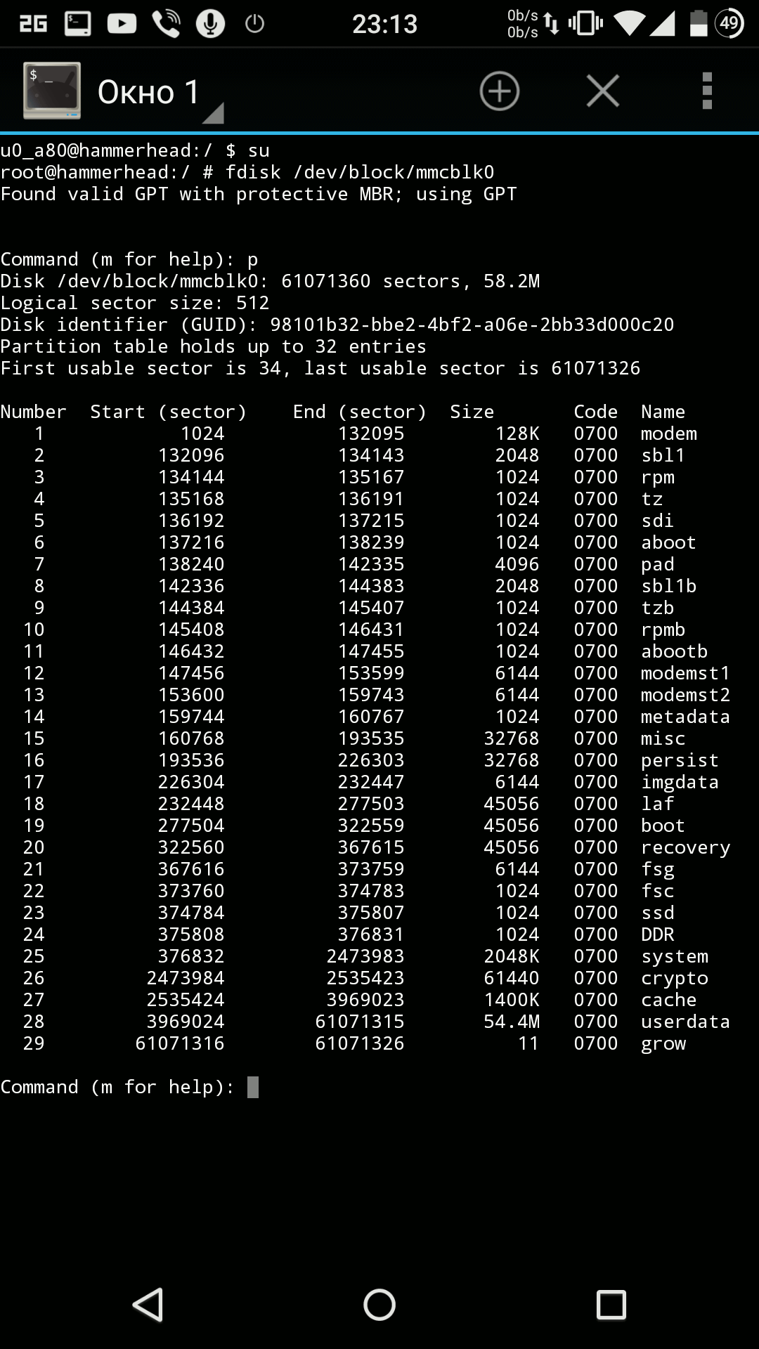 Вывод разделов Nexus 5 с помощью эмулятора терминала на прошивке ниже 6.0
