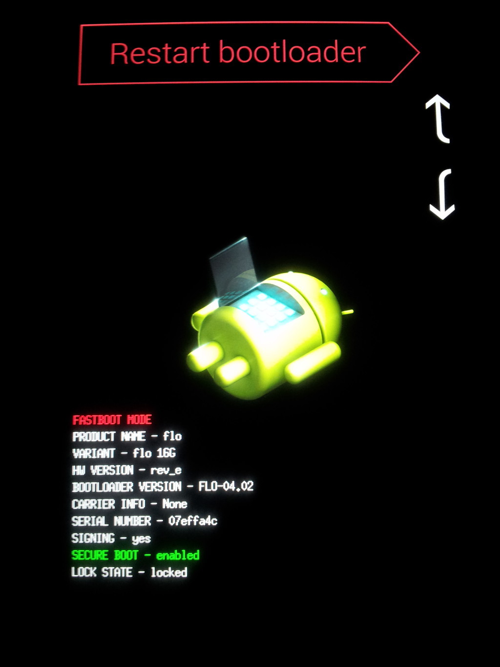 Еще иногда при попытках найти верную комбинацию пользователи попадают в Fastboot mode. В такой ситуации мы наблюдаем лежащего «Андроида» открытым брюхом/пузом, но без восклицательного знака. Пример такого меню у Nexus 7 (2013) на фото: