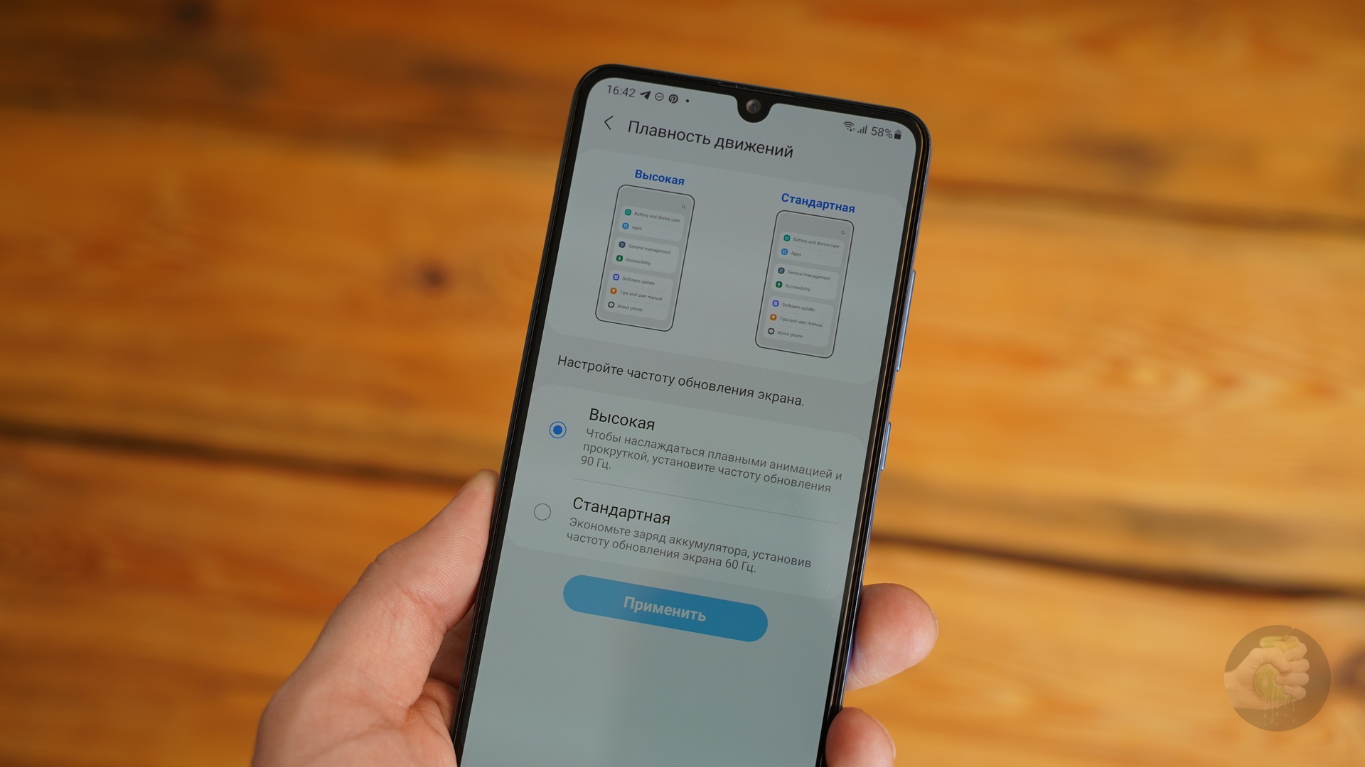 Важным отличием от Galaxy A31 стала поддержка частоты 90 Гц: теперь интерфейс работает плавнее, а если хочется немного сэкономить заряд батареи, функцию можно отключить в настройках. Также увеличился запас по яркости с 600 до 800 нит, он особенно пригодится в погожие солнечные дни.