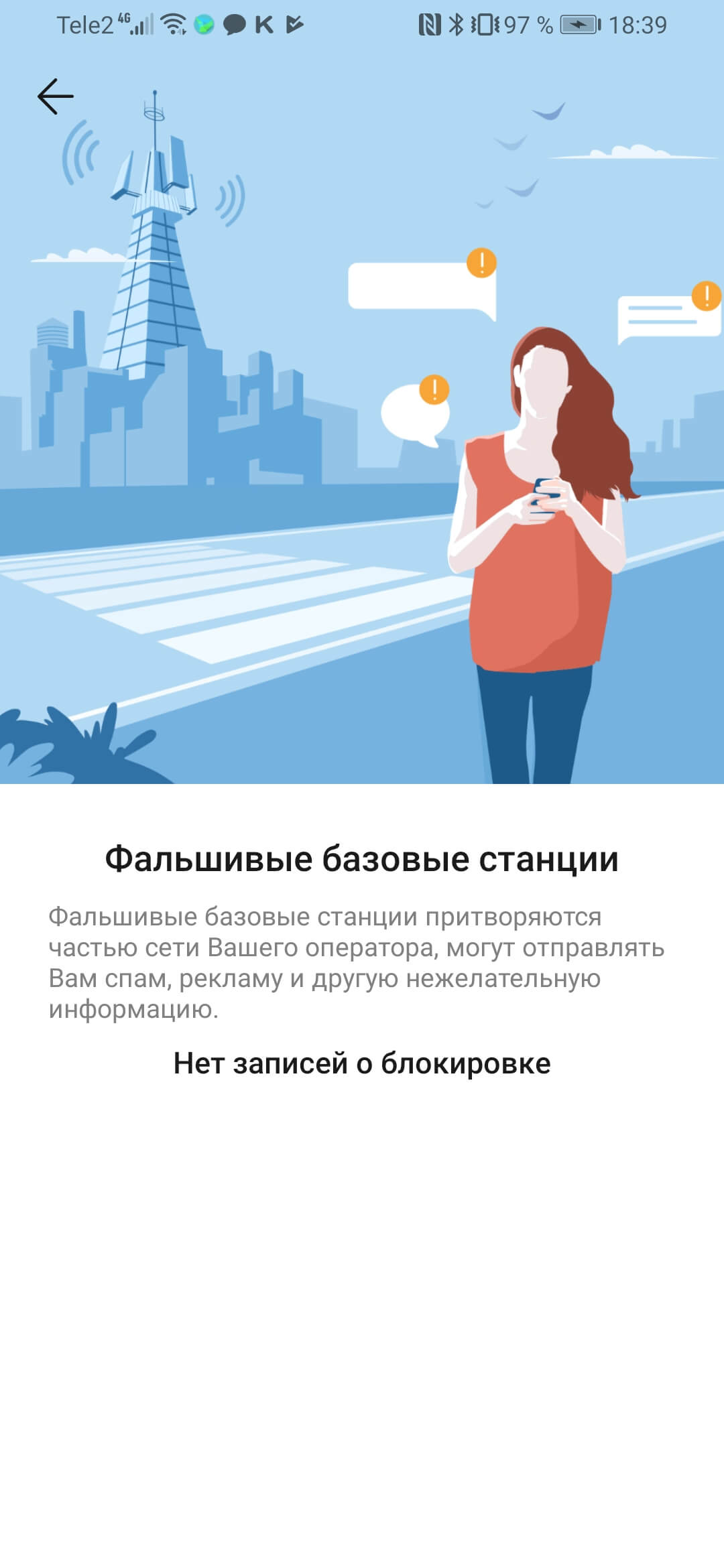 Во вкладке «Безопасность и конфиденциальность» есть такие функции как «Фальшивые базовые станции», которая содержит в себе статистику о блокировке сотовых точек, которые рассылают спам, либо рекламные предложения