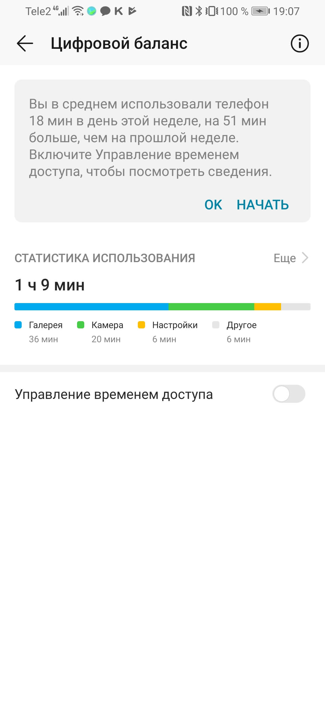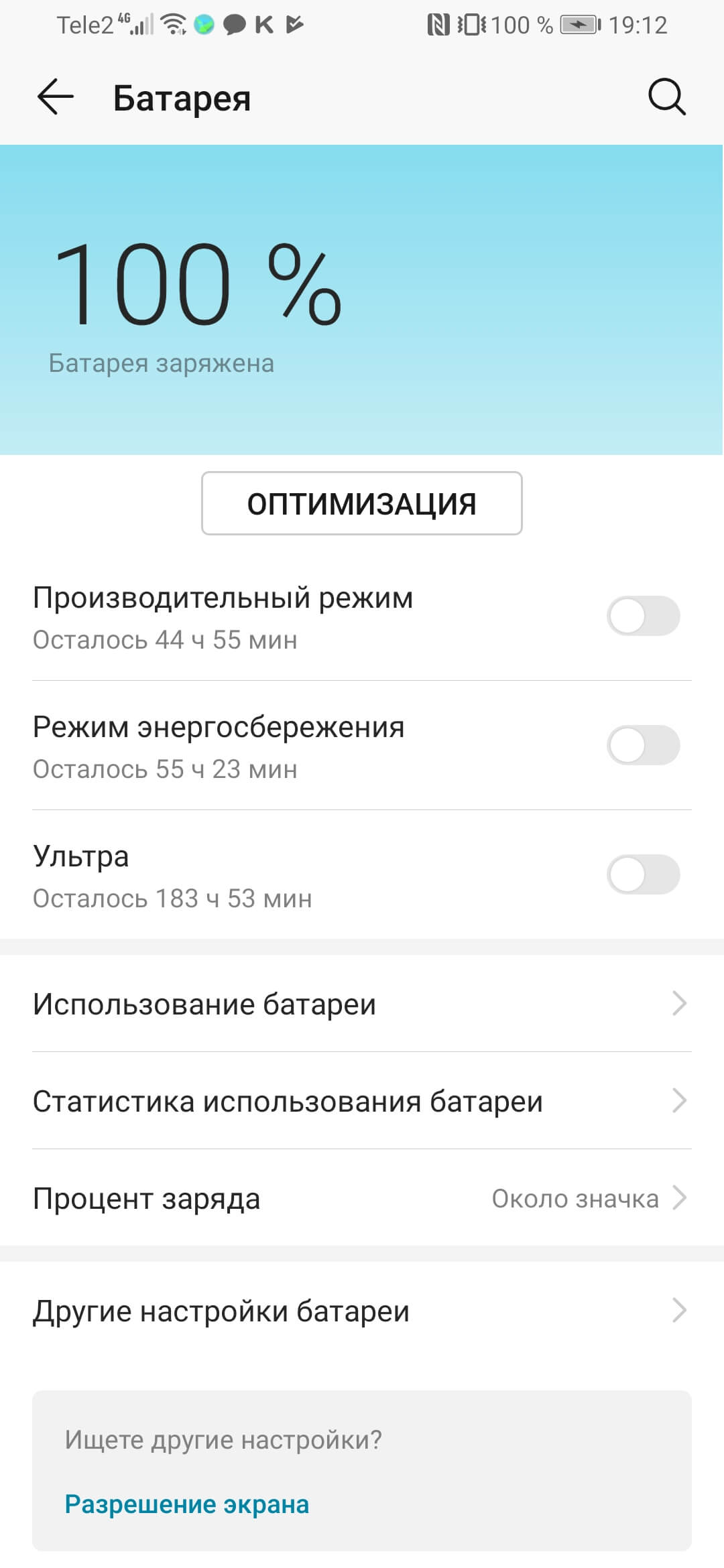В настройки также входит встроенная утилита «Цифровой баланс», которая включает в себя контроль за статистикой использования приложений. Во вкладке «Батарея» есть параметр оптимизации, который не только закроет ненужные приложения, но и предложит вручную отключить GPS или вибрацию. Батарея имеет три режима: «Производительный», «Энергосберегающий» и «Ультра». Каждый из них отключает либо самые ненужные утилиты и программные модули, либо делает тотальное отключение всего и вся, ради сохранения уровня батареи.