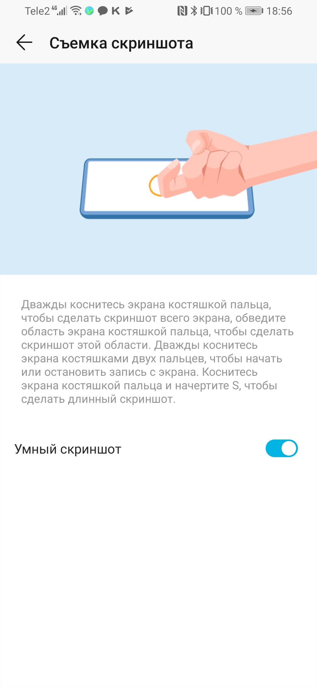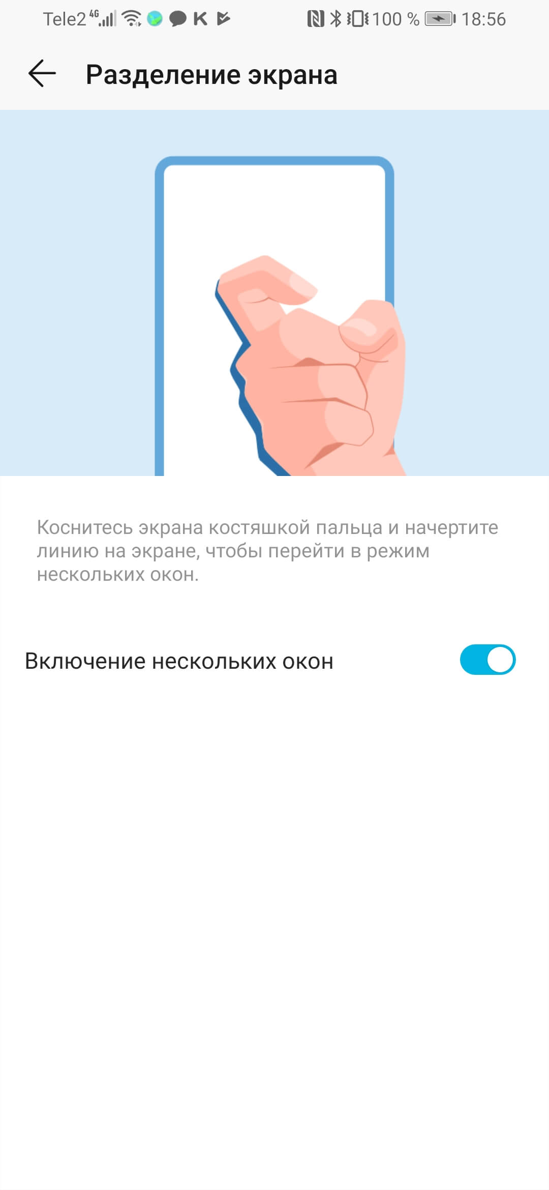 Со-процессор чипсета Kirin 980 отвечает за положение гироскопа и связанных с изменением градуса наклона функций движений. Можно перевернуть, взять и поднести к уху, сделать скриншот трёмя пальцами. Можно так же управлять выполнение действий с помощью костяшки пальца. К слову, костяшкой можно разделять экран на программы.