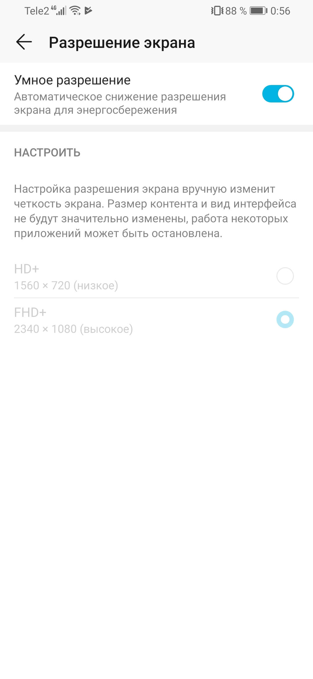 Смартфон может программно уменьшать разрешение экрана до уровня 2340×1080 (FHD+) или 1560×720 (HD+), тем самым экономя разряд аккумуляторной батареи и повышая графическую производительность гаджета. Если вы не видите разницу, то «Умное разрешение» лучше включить сразу – это станет только плюсом в работе аппарата.