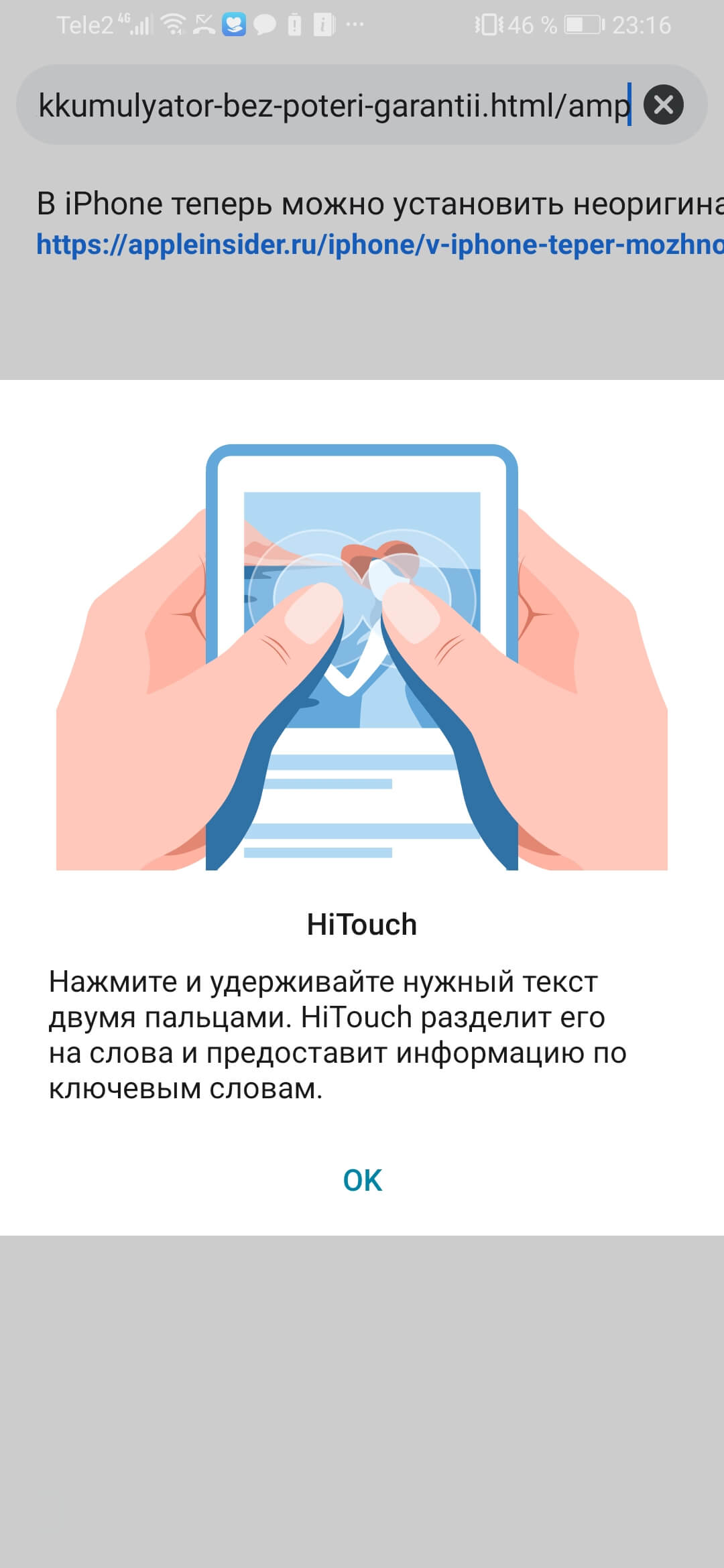 Системный сервис HiTocuh предустановлен для выделения и анализа конкретных слов или словосочетаний, предложений, чтобы их проанализировать и выдать связанные с этим сервисом службы информации или доставки.