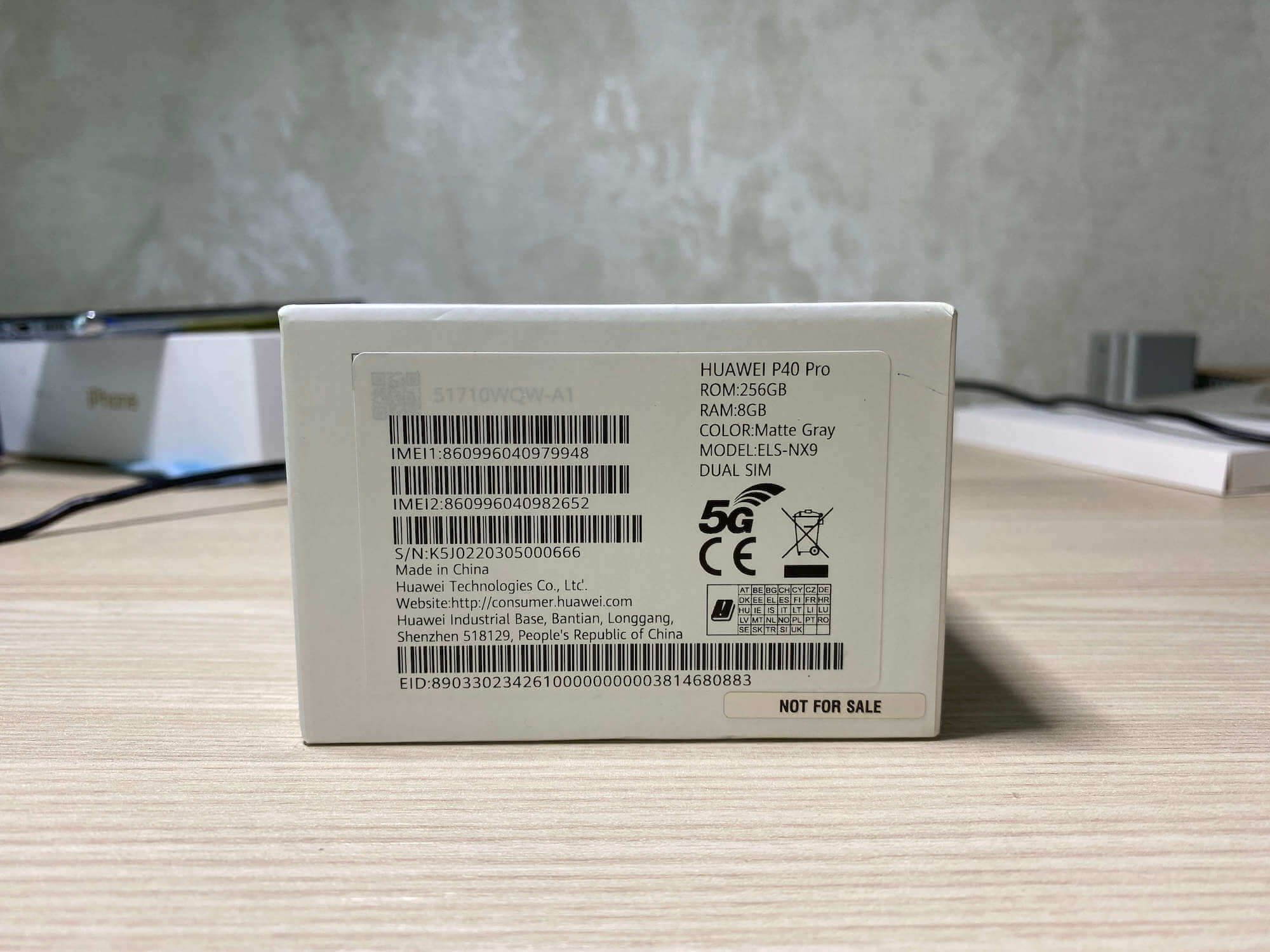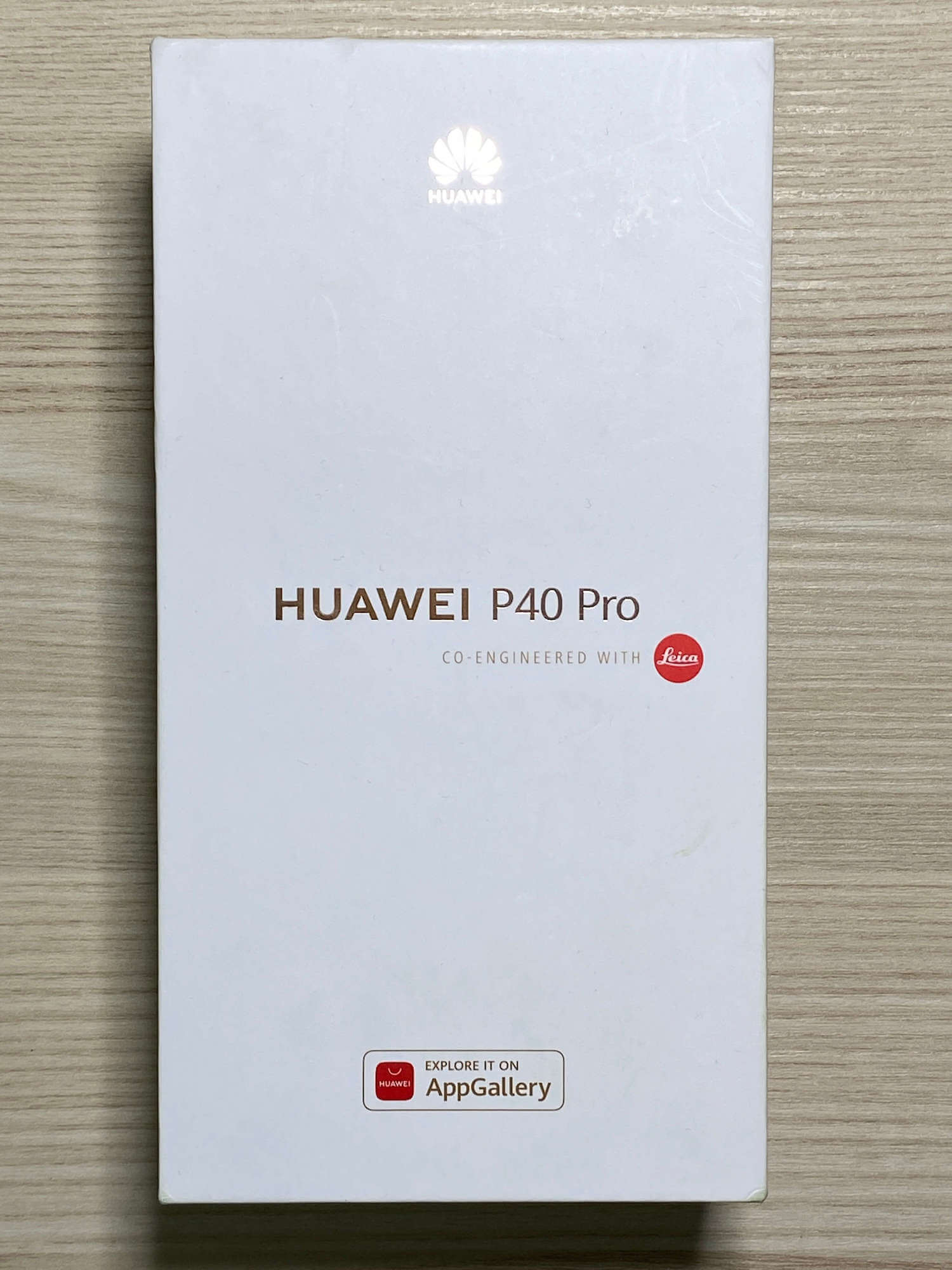 Huawei P40 поставляется в огромной белой коробке с минимальным набором текста, с указанием на использование собственного магазина AppGallery и что разработка велась непосредственно с компаний Leica.