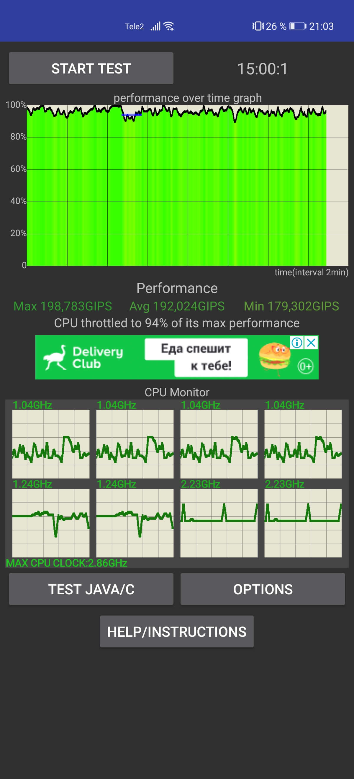 После активации производительного режима ситуация преобразилась в лучшую сторону: 15-минутный тест продемонстрировал троттлинг всего лишь в 5%. Однако датчики показали температуру значительно выше — 60°, которая может ощущаться менее комфортной при удерживании в руках.